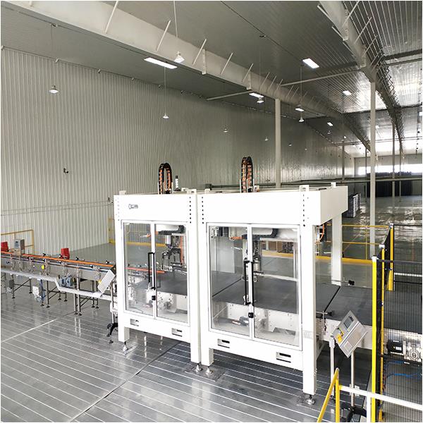 恒昌包裝自主生產(chǎn)制造的低位雙通道碼垛機(jī),速度可達(dá)80包/分。
